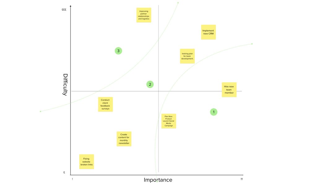 The benefits matrix (also known as the importance:difficulty matrix) is a tool best facilitated. Appoint one member of the team to do this - whilst the rest of the team debates the projects, tasks or ideas and plots the notes on the matrix - the facilitator ensures the correct use of the tool whilst taking care not to influence group decisions.